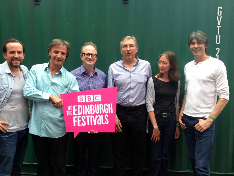 Richard played the role of Gilmanuk in "Theatre of War," a Dr Who audio drama starring Sylvester McCoy (Big Finish Productions.) He appeared as Julian in the sitcom 'The Littlest Boho' (Nerd Productions) which featured in the 2016 Raindance programme. Richard has guested on BBC Radio 4's Infinite Monkey Cage with Prof Brian Cox and Robin Ince (pictured below) and in the General Relativity centenary specials. With Pippa the Ripper he was half of the science hula-hoop act "Dr Hula." Other TV credits include "Weakest Link Doctor's Special" (BBC1) and "Hello Mum" (live BBC2 sitcom, as Bernie Bermuda.)